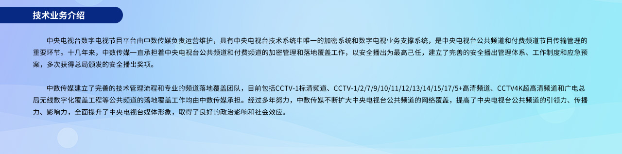 2018年10月開始,中數傳媒負責中國首個上星超高清電視頻道—中央廣播電視總臺4K超高清頻道的傳輸和落地宣傳工作,基本實現(xiàn)了中央廣播電視總臺4K超高清頻道的全國覆蓋。
